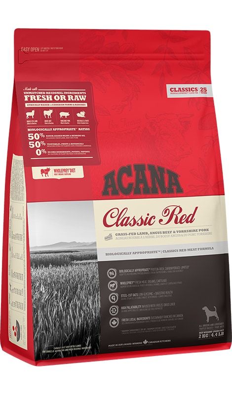 Acana Classic Red sucha karma dla psów wszystkich ras, o bogatym składzie, w którym króluje  jagnięcina, wołowina angus oraz wieprzowina yorkshire. Mięso dostarczane jest codziennie świeże lub surowe w odpowiednich proporcjach diety WholePrey™, aby zapewnić wszystkie składniki odżywcze dla Twojego psa. Karma Acana nie zawiera wysokoglikemicznych zbóż, zawiera wysoką zawartością białka, które jest pochodzenia zwierzęcego i kwasy Omega-3, które pozytywnie wpływają na świetną formę psa.