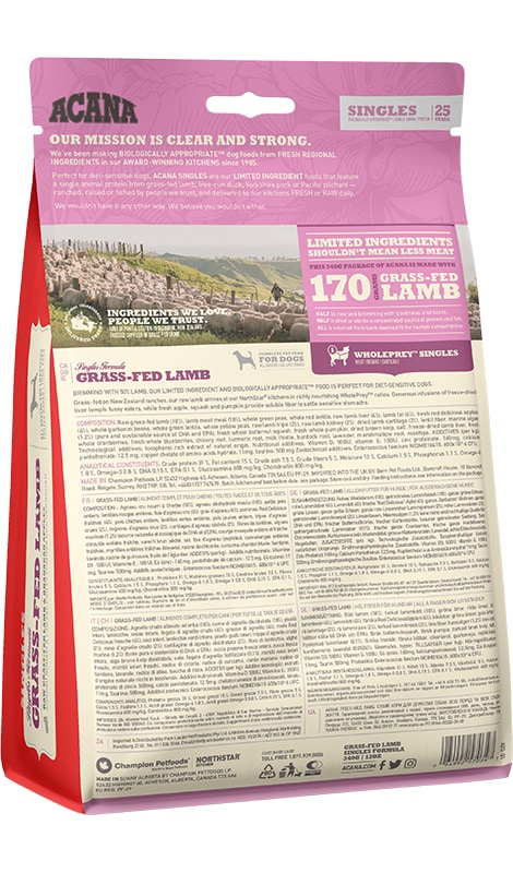 Acana Grass-Fed Lamb sucha karma monobiałkowa dla psów w każdym wieku o bogatym składzie, w którym króluje mięso z nowozelandzkiej jagnięciny w proporcjach diety WholePrey™, aby zapewnić wszystkie składniki odżywcze dla Twojego psa. Karma zawiera dodatek wątróbki liofilizowanej, która wpływa na świetny smak, a dodatek świeżej dyni jest źródłem włókien, które w pozytywny sposób wpływają na trawienie.