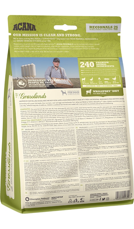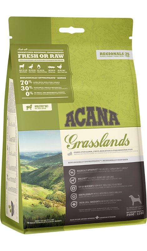 Acana Grasslands sucha karma dla psów wszystkich ras i w każdym wieku o bogatym składzie, w którym króluje jagnięcina, kaczka z wolnego wybiegu, jaja ściółkowe i ryby - wszystko w proporcjach WholePrey™. Wszystko dostarczane jest świeże lub surowe z regionu Alberty, aby zapewnić wszystkie składniki odżywcze dla Twojego psa. Karma Acana zawiera ograniczoną ilość węglowodanów, wysoką zawartością białka, które jest pochodzenia zwierzęcego, które pozytywnie wpływają na świetną formę psa.