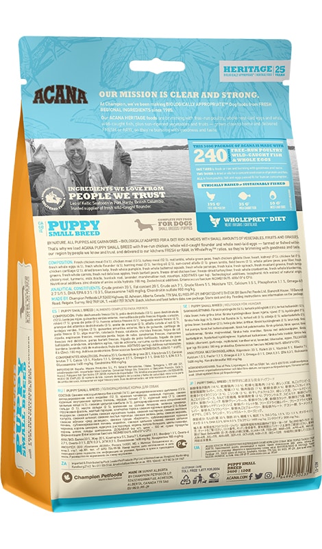 Acana Small Breed Puppy sucha karma dla szczeniąt małych ras, które w wieku dorosłym osiągają wagę do 9kg. W jej składzie króluje mięso kurczaków z chowu bezklatkowego, jaja ściółkowe, mięso storni poławianej w naturalnym środowisku oraz dojrzewające w słońcu owoce i warzywa. Wszystko dostarczane jest świeże lub surowe z regionu Alberty, aby zapewnić wszystkie składniki odżywcze dla Twojego szczeniaka.