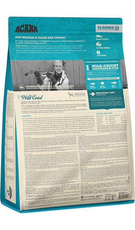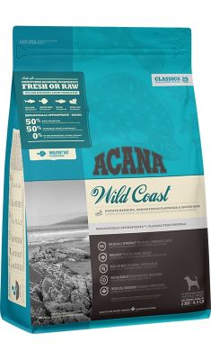 Acana Wild Coast sucha karma dla psów wszystkich ras, o bogatym składzie, w którym króluje śledź pacyficzny, flądra oraz morszczuk srebrzysty. Ryby dostarczane są świeże w całości, z połowów w naturalnym środowisku z koli wyspy Vancouver, aby zapewnić wszystkie składniki odżywcze dla Twojego psa. Karma Acana nie zawiera wysokoglikemicznych zbóż, zawiera wysoką zawartością białka, które jest pochodzenia zwierzęcego i kwasy Omega-3, które pozytywnie wpływają na świetną formę psa.