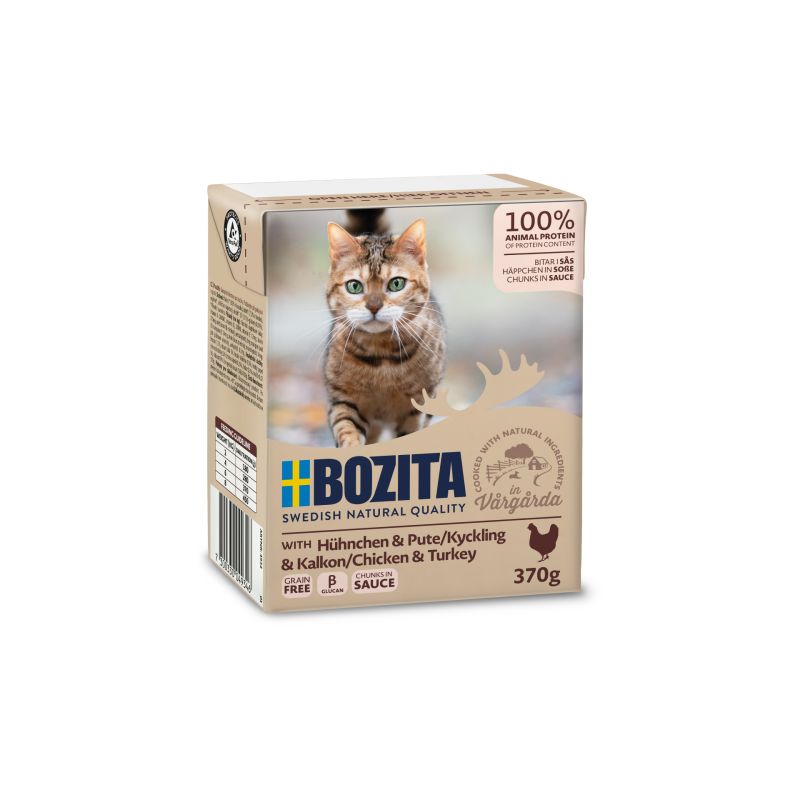 Bozita mokra karma w kartoniku z kurczakiem i indykiem w sosie to szwedzka jakość i smakowite rozwiązanie żywieniowe dla Twojego kota. Jest to pełnoporcjowa, bezzbożowa karma, która w swoim składzie nie zawiera glutenu, cukru, soi i sztucznych konserwantów. Te pyszne mięsne kawałki są pełnowartościowym posiłkiem dla Twojego pupila, każda porcja to aż 93% mięsa i zawiera aminokwasy, witaminy oraz minerały zaspokajające codzienne zapotrzebowanie Twojego kota. Jest także wsparciem dla układu odpornościowego, ponieważ zawiera aminokwas Macrogard. Swoim smakiem i aromatem zachwyci nawet wyszukane podniebienie Twojego pupila.