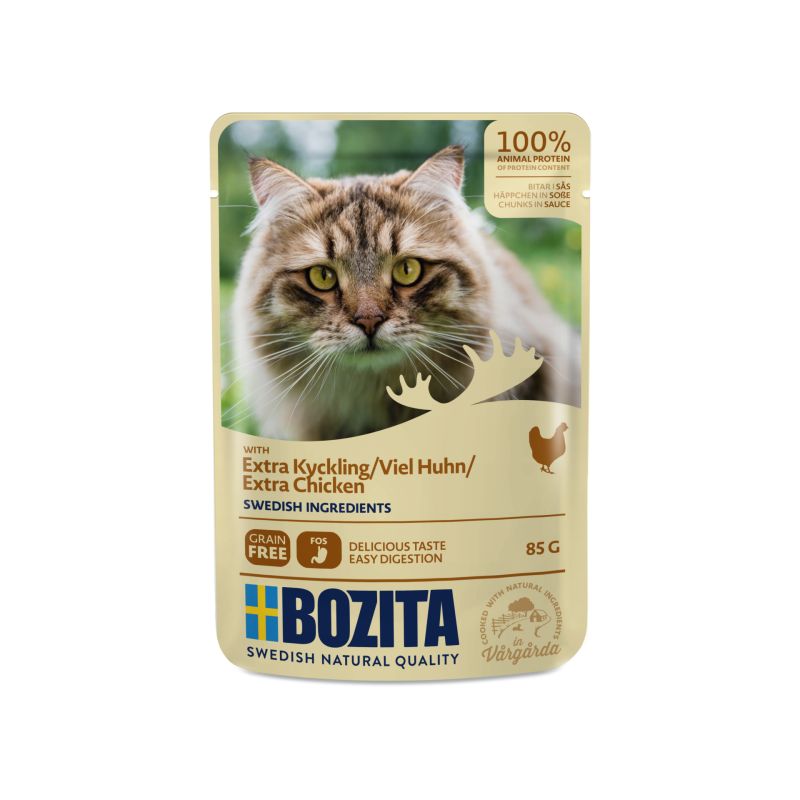 Bozita mokra karma w saszetkach w sosie to szwedzka jakość i smakowite pożywienie dla Twojego kota zawierające wszystkie niezbędne witaminy, aminokwasy i minerały. Jest to pełnoporcjowa, bezzbożowa karma, bez GMO, która w swoim składzie nie zawiera glutenu, cukru, soi ani żadnych barwników i sztucznych konserwantów. Te pyszne mięsne kawałki w sosie są pełnowartościowym posiłkiem dla Twojego pupila a swoim smakiem i aromatem zachwyci nawet wyszukane podniebienia.
