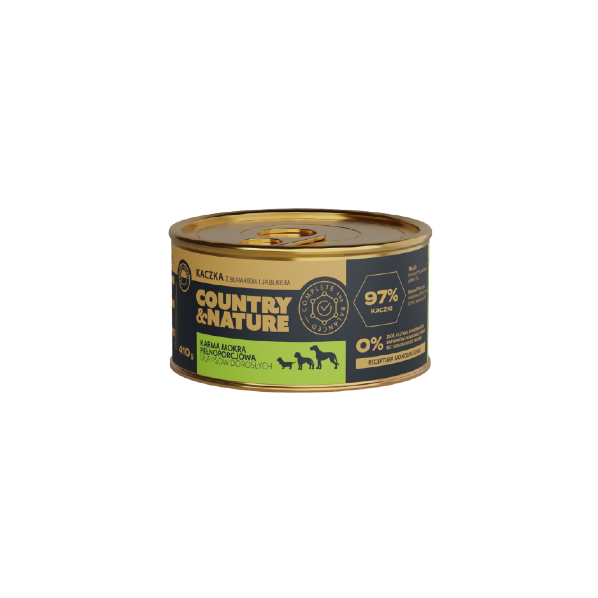 Karma mokra COUNTRY&NATURE to pyszna monoproteinowa karma jakości premium, na bazie kaczki z burakiem i jabłkiem dla dorosłych psów wszystkich ras w formie aromatycznego pasztetu w sosie własnym. Burak pozytywnie wpływa na odporność i działanie układu krwionośnego, ma w sobie składniki mineralne