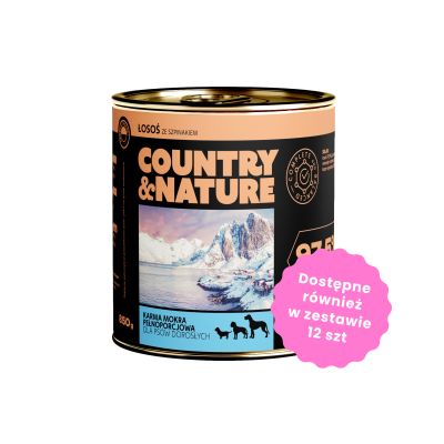 Karma mokra COUNTRY&NATURE to pyszna monoproteinowa karma jakości premium, na bazie łososia ze szpinakiem dla dorosłych psów wszystkich ras w formie aromatycznego pasztetu w sosie własnym.