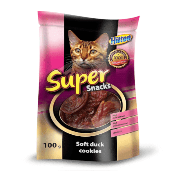 Hilton Pyszne Super Snacki zawierają wysoką zawartość mięsa i białka. Są to wysokiej jakości naturalne, suszone przekąski, świetnie sprawdzają się jako uzupełnienie karmy podstawowej dla kotów. Nie zawierają sztucznych dodatków, cukrów ani zbędnych tłuszczy. Miękkie ciasteczka będą idealną przekąską między posiłkami.