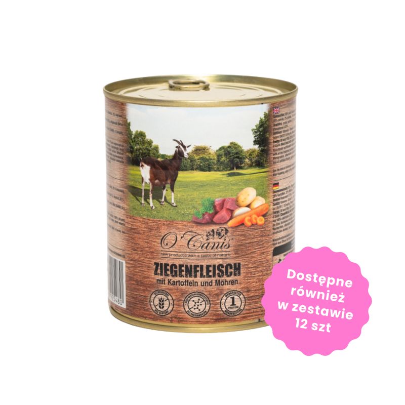 Karma mokra O'Canis to pyszna karma jakości premium, w sosie własnym ze świeżym mięsem, na bazie kozy z ziemniakami, pietruszką i marchewką dla psów w każdym wieku. Delikatna obróbka, powoduje, że karma jest wyjątkowo niedrażniąca, gwarantuje wysoki poziom tolerancji i łatwość trawienia, jest to świetne rozwiązanie dla psów z nietolerancją pokarmową.