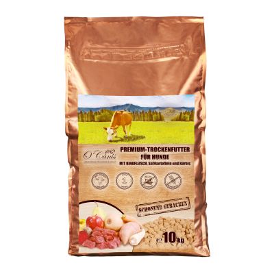 Pełnoporcjowa suchaO'Canis karma pieczona z wołowiną, słodkimi ziemniakami i dynią 10kg karma O'Canis premium z mięsa wołowego, słodkiego ziemniaka i dyni to bardzo dobrze strawna karma dla dorosłych psów wszystkich ras. Poddana procesowi pieczenia, dzięki czemu nie dodaje się do niej żadnych sztucznych dodatków czy tłuszczy, jest bezzbożowa i bezglutenowa.