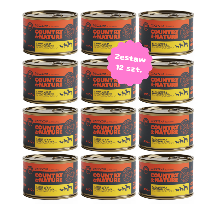 Karma mokra COUNTRY&NATURE to pyszna monoproteinowa karma jakości premium, na bazie dziczyzny z żurawiną dla dorosłych psów wszystkich ras w formie aromatycznego pasztetu w sosie własnym. Żurawina ma działanie przeciwstarzeniowe oraz przeciwbakteryjne dbając o układ moczowy, zawiera związki mineralne (sód, selen, potas), luteinę, β-karoten, polifenole oraz witaminy C, A, E.