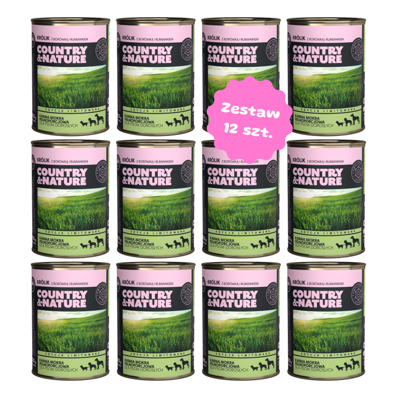 Skład: 68% Królik (60% mięso, 8% wątroba), 26,4% Bulion z królika, 4% Borówka amerykańska, 1% Minerały, 0,2% Pestki dyni, 0,2% Olej lniany, 0,1% Extrakt Yucca Mojave, 0,1% Rumianek