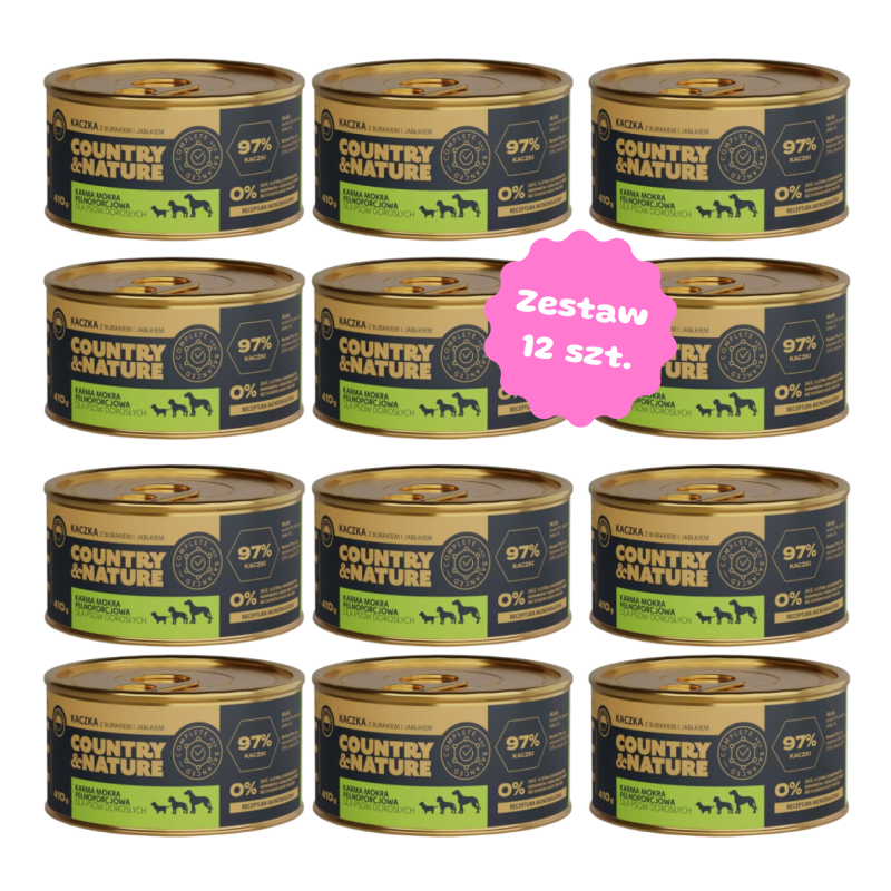 Karma mokra COUNTRY&NATURE to pyszna monoproteinowa karma jakości premium, na bazie kaczki z burakiem i jabłkiem dla dorosłych psów wszystkich ras w formie aromatycznego pasztetu w sosie własnym. Burak pozytywnie wpływa na odporność i działanie układu krwionośnego, ma w sobie składniki mineralne (wapń, fosfor i potas) i witaminy C, A, K, E oraz kwas foliowy. Karma w swoim składzie nie zawiera zbóż, sztucznych aromatów, żadnych barwników czy konserwantów.