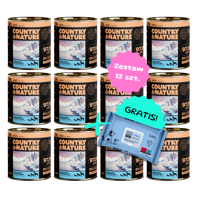 Karma mokra COUNTRY&NATURE to pyszna monoproteinowa karma jakości premium, na bazie łososia ze szpinakiem dla dorosłych psów wszystkich ras w formie aromatycznego pasztetu w sosie własnym. Karma w swoim składzie nie zawiera zbóż, sztucznych aromatów, żadnych barwników czy konserwantów.