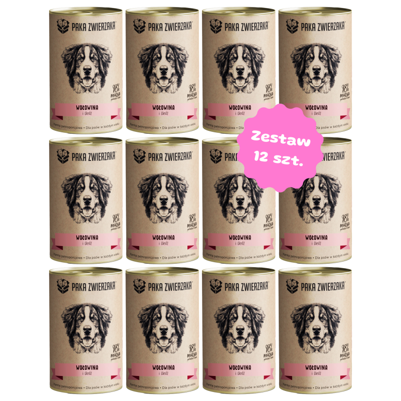 Zestaw 12 puszek 400g - PAKA ZWIERZAKA Wołowina i śledź karma mokra dla psów w każdym wieku