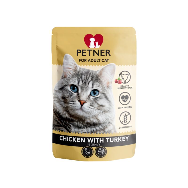 Petner Adult Cat z kurczakiem i indykiem, z dodatkiem żurawiny, saszetka 85g